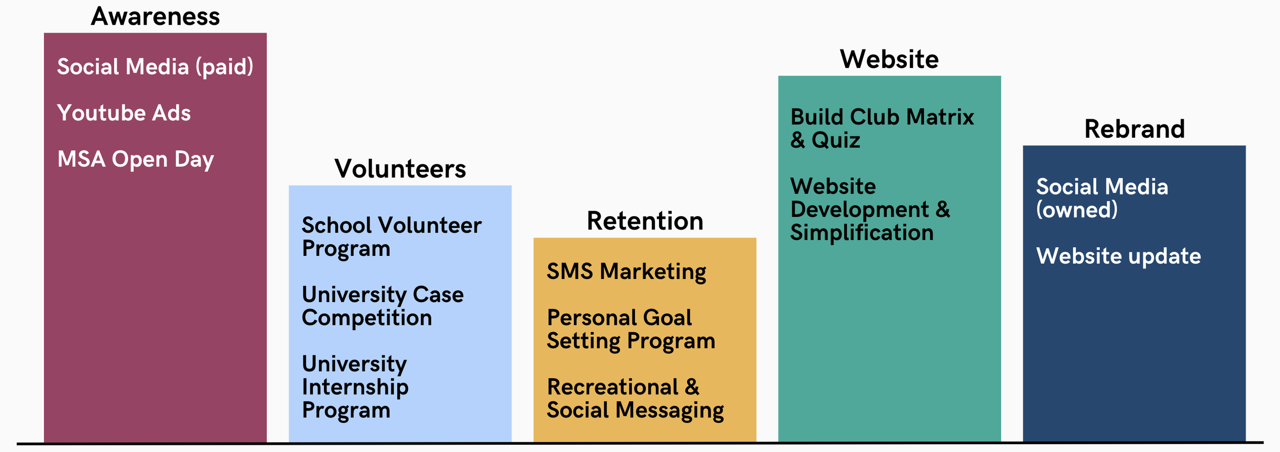 University Case Competition: MSA can collaborate with universities and their societies for contests where students design websites, propose marketing campaigns, etc., with internships as incentives. This strategy builds connections between MSA, students, and universities, fostering mutually beneficial opportunities and enhancing awareness among a younger demographic.